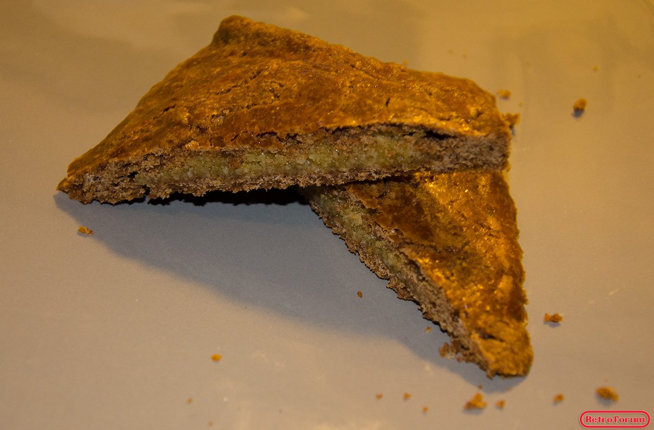 Een gevulde koek van roomboterspeltdeeg (deels volkoren) met speculaaskruiden en zelfgemaakte amandelspijs.