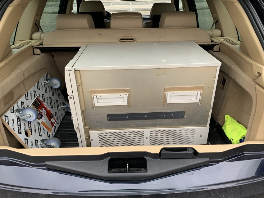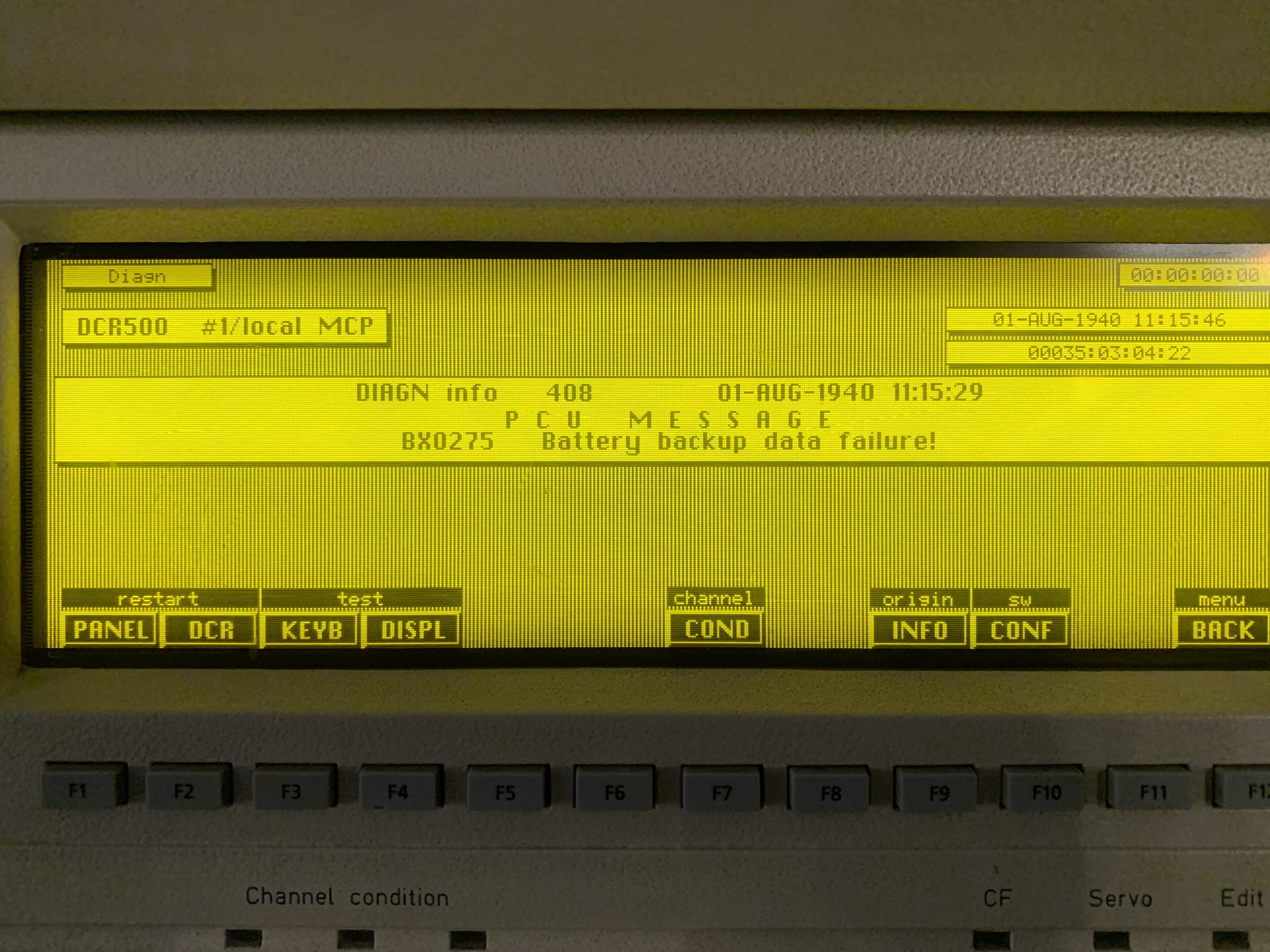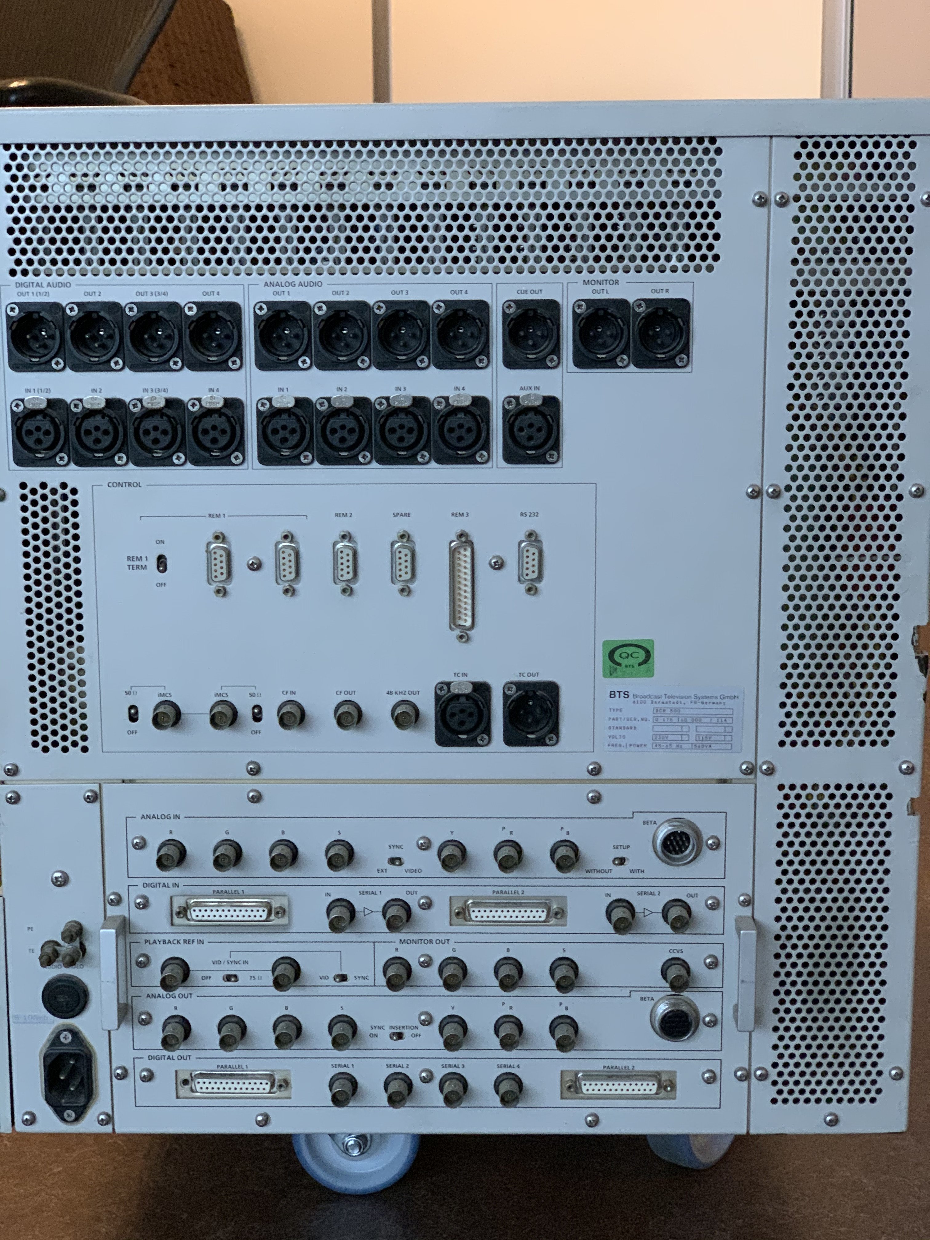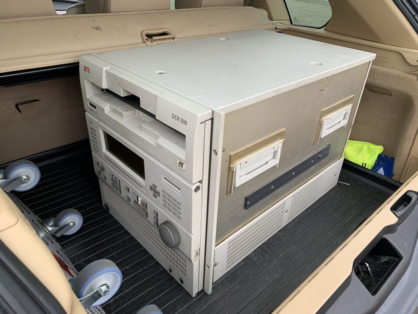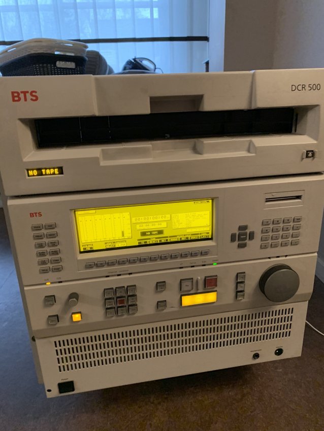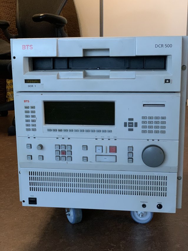 Sommigen van jullie hebben hem al voorbij zien komen maar vandaag heb ik een van de eerste digitale videorecorders opgehaald, een BTS DCR 500 D1. De machine maakt gebruik van enorme banden en deze generatie machines waren destijds bedoeld als digitale vervanger van de BCN machines. De geschiedenis van deze machine was onbekend evenals de werking. Ik begreep dat er machines zijn met problemen met voedingen dus het was even spannend. Nadat ik de machine had schoongemaakt en geïnspecteerd op mogelijke defecte ontstoringscondensatoren (rookbommen) heb ik het erop gewaagd en de stekker erin gestoken. Dat viel nog niet tegen, de machine ging gewoon aan en startte op. Het scherm kwam op en de enige melding was van een backup batterij die te weinig capaciteit had, deze melding verdween overigens later kennelijk laadt hij op. Een tape heb ik helaas nog niet voor deze machine maar hoop ik binnen een paar weken te kunnen hebben. Dan kunnen we testen of het loopwerk ook in orde is en of er beeld uitkomt. Het idee is om de D1 in de Omroepwagen te plaatsen naast de BCN51 en de digibeta's. Dan hebben we wel een goede 30 jaar recordertechniek op een rij. Zodra ik een tape heb zal ik een update plaatsen. Een paar plaatjes: De machine is dus gewoon niet normaal zwaar, ik schat zeker 50 kilo. Ter indicatie, dit is de kofferbak van een BMW X5 waarvan het zeiltje niet meer dicht kon. Eerst even rustig bekeken en wat schoongemaakt. Er zitten best veel aansluitingen op. Ik moet alles nog uitzoeken en begrijpen. Power up melding, dat valt alles mee. Alles ziet er werkend uit. Firmware is van 1994 2 korte filmpjes. De D1 heeft een plasma scherm dat destijds ook op de BTS DD20 heeft gezeten. Resfesh rate van weinig maar wel voldoende scherp en goed afleesbaar. (De refreshbanen zie je in het echt overigens niet) Hier loop ik door wat instellingen heen, de machine kan helemaal op maat geconfigureerd worden. Zie ook dat het bedienpaneel uitgeklapt is.