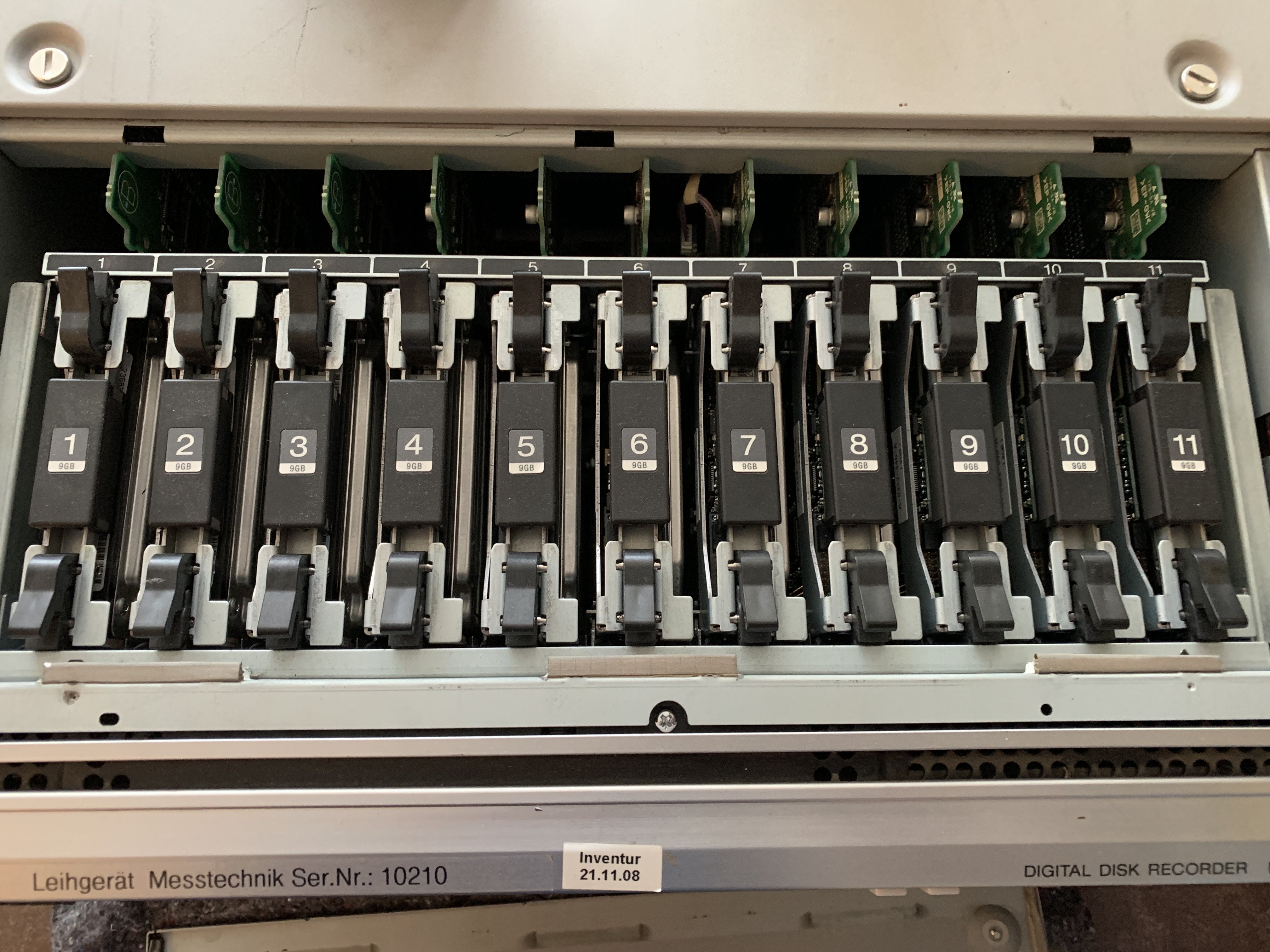Ook niet goed voor de rug is een Sony MAV 555, een oude harddisk recorder van 1999 - 2000. De MAV heeft een array van 11 Seagate 9GB 10k ultra 2 wide schijven, ik denk zelfs in RAID ipv JBOD. De schijven booten netjes een voor een op om de stroomlast te verdelen, prachtig geluid. Ik had een testopstelling gemaakt om alle nieuwe oude spullen eens te proberen voordat ik ze in de bus ga bouwen. De Sony MAV heb ik nog niet helemaal onder controle en moet ik nog zien uit te vinden, Opnemen doet hij overigens wel al dus dat gaat goed. In de opstelling had ik een: BTS DCR 500, Sony MAV 555, Grass Valley Indigo, Sony PDW530 en ook nog ergens een Sony J3 plus wat eenvoudig audiospul Filmpje ! eerst de reuzentape van de DCR 500. Die is echt onwerkelijk groot. Hier werkt het spul allemaal samen, in de tapes die ik gisteren had opgehaald zat eentje met Madonna. De kwaliteit is onwerkelijk goed en scherp voor dergelijke oude tapes. Morgen eens proberen of ik signaal krijg naar de OLED tv om te zien hoe dat eruit ziet. De Indigo heet DVI uit dus dat zou moeten lukken met een verloopkabel.
