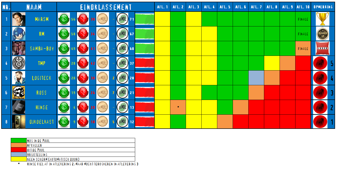 Zo! Het zit er op . Zoals beloofd en zoals aangegeven geef ik hieronder nog de volledige openheid van deze Pool met een kleine uitleg waar nodig. De statistieken, standen en schema's staan inmiddels ook al in de OP vermeld. Om te beginnen; Hierbij de gehele eindstand van deze Pool. De verschillen onderling lijken groot, maar logischerwijs kon je geen punten meer halen voor de Pool wanneer je een rood scherm kreeg. Dan volgen vervolgens hieronder de puntenoverzichten van iedere deelnemer; Deze standen kregen jullie persoonlijk voor jouw situatie wekelijks via pb doorgestuurd. Groene vakjes zijn vakjes waarvoor een punt is verdiend, rode vakjes zijn vakjes waarbij voor die vraag het verkeerde antwoord werd gegeven Jokers op een groene achtergrond zijn jokers die zijn verzilverd, jokers met een paarse achtergrond zijn jokers waarvoor het punt niet is verdiend (omdat daarvoor al een rood scherm is ontvangen) De sterretjes achterin het schema staan voor eventueel juist voorspelde afvallers Dan hieronder alle 100 vragen met daarbij de juiste antwoorden en de antwoorden die per user zijn gegeven; De kleuren van die antwoorden corresponderen weer met de puntenoverzichten hierboven; We gaan nu een laagje dieper, door hieronder te laten zien hoeveel punten iedereen wekelijks heeft gescoord en wanneer iedereen heeft ingezonden. Deze informatie werd eerder al in samenvatting door Rik afgelopen zaterdag medegedeeld, maar nu hebben jullie de mogelijkheid om alles rustig te bekijken. En dan hebben we natuurlijk nog alle statistieken die bijgehouden moesten worden.... Allereerst moest voor vraag nummer 27 bijgehouden worden wie het vaakst zijn scherm te zien heeft gekregen (dit antwoord is Sarah, zoals groen omcirkeld) Dan werden er ook regelmatig vragen gesteld over zaken die pas later in het seizoen bekend werden, maar wel bijgehouden moesten worden. Zoals jullie zien staan boven iedere kolom de vraagnummers vermeld; De goede antwoorden staan wederom weer in de groene cirkels; En als laatste stelden we ook steeds vragen over de Mol (elke wekelijkse 9e vraag) Ook deze statistieken werden genoteerd en wederom staan de vraagnummers vermeld in de kolommen; Zoals jullie zien is het een enorme klus geweest, maar ik vond het zeker de moeite waard! Graag wil ik ook duidelijk benadrukken dat ik de Pool niet in mijn eentje heb georganiseerd; Zonder MarsM was deze Pool zeker niet zo geslaagd geweest als nu!! MarsM en ik hebben wekelijks veel tijd besteed aan het verzinnen van de 100 vragen en MarsM heeft de taak op zich genomen om alle Rik printscreens wekelijks voor te bereiden. Hij kreeg daarvoor elke week de benodigde informatie om dit te kunnen doen en heeft dus nooit inzage gehad in de standen. Alle overzichten, statistieken en schema's zijn door mij in elkaar gezet en bijgehouden. Bijgaand nog de awards, zodat die weer uitgedeeld kunnen worden . Rest mij nog te zeggen dat ik als allerlaatste nog de code geef aan TMP, zodat hij de mogelijkheid heeft om al mijn inzendingen te controleren mocht daar behoefte aan zijn. Maar zoals jullie wel zien viel er niets te sjoemelen . Ik wil jullie enorm bedanken voor jullie enthousiasme, jullie sportieve deelname en jullie inzet . En ik hoop uiteraard ook dat we deze opzet volgend jaar weer kunnen gaan doen. Het zou tof zijn als jullie laten weten wat jullie van deze opzet vonden en mochten jullie nog punten hebben voor de evaluatie, laat dit dan gerust weten!