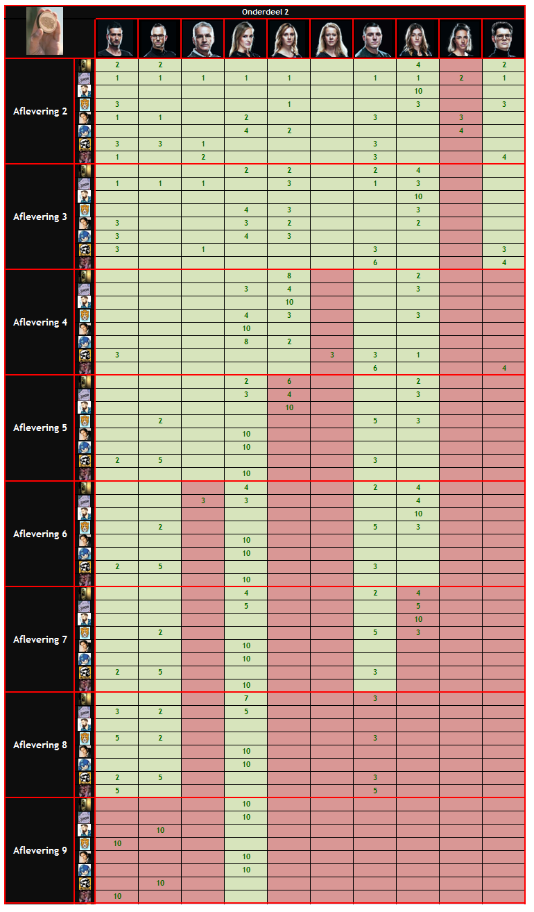 De eerste afvaller is bekend en de OP is al bijgewerkt. Dit jaar worden in het schema niet de behaalde punten weergegeven, maar de punten die potentieel nog behaald kunnen worden. Voor onderdeel 1 is het maximaal aantal te behalen punten 208 (40+36+32+28+24+20+16+12). Voor onderdeel 2 is het maximaal aantal te behalen punten 80 (8x10 pasvragen (jokers)). Als een kandidaat uit het spel ligt dan worden voor zowel onderdeel 1 als onderdeel 2 de misgelopen punten direct afgetrokken van het potentiƫle eindtotaal. Je krijgt dus ook puntenaftrek als de afvaller van de week niet goed is voorspeld. Op deze manier heeft iedereen een iets inzichtelijker weergave van hoeveel punten iedereen nog kan halen.