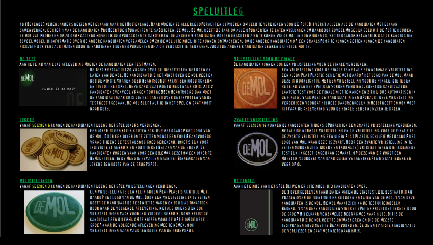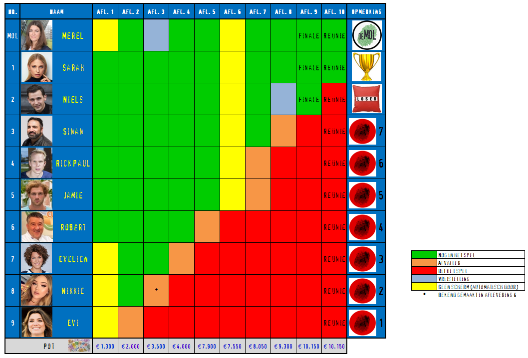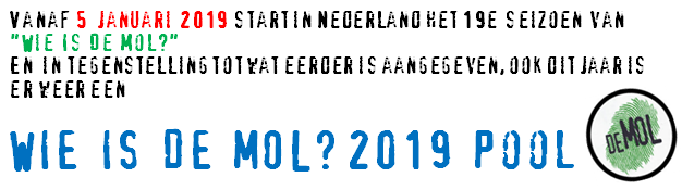 Afleveringen: Zaterdag, 20:30 (NPO 1) Moltalk (Nabeschouwing na elke aflevering): Zaterdag, 21:30 (NPO 3) De Kandidaten Afgevallen Kandidaten Hoe werkt het spel (programma)? Hieronder staat overzichtelijk uitgelegd hoe het spel werkt. Mocht je het televisieprogramma nog niet eerder hebben gezien dan wordt zeker aangeraden om onderstaande door te lezen, zodat je de spelregels begrijpt. De Pool Het Invulbestand Hieronder een afbeelding van het invulbestand met uitleg. De puntentelling Spelregels Pool Spelverloop Hieronder staat het schema met de volgorde waarin de kandidaten afvallen (en waarin dus ook te zien is wie er nog in zitten. Logischerwijs is het schema nu nog leeg, maar die wordt per aflevering ingevuld. Onderin het schema wordt ook het bedrag in de pot per aflevering bijgehouden. Voorbeeld van een Tussenstand Inzendingen & Tussenstand In tegenstelling tot voorgaande pools was altijd de tussenstand zichtbaar. In deze pool is dat anders; Alle inzendingen, voorspellingen, antwoorden, inzetten van jokers en tussenstanden blijven onzichtbaar voor alle deelnemers om zo de spanning voor een mogelijk rood scherm zo groot mogelijk te maken. Het enige wat zichtbaar is van je concurrenten is welke kandidaat zij verdenken als mol en wie zij denken dat er afvalt per aflevering (dus de wekelijkse "Wie Is De Mol" vragen en de bonuspunten - zie onderstaand schema) De persoonlijke tussenstanden worden wel wekelijks per pb naar de deelnemers gestuurd, zodat ze zelf wel weten hoe ze ervoor staan. Daarin is ook te zien hoeveel vragen de deelnemer goed heeft beantwoord, hoeveel vragen er fout zijn, op hoeveel vragen een joker staat, hoeveel jokers de deelnemer nog in kan zetten en hoeveel punten de deelnemer op dat moment heeft. Daarentegen staat hieronder wel een schema van de deelnemers aan de pool die dezelfde strekking heeft als het schema onder het spelverloop van de kandidaten in het programma (dus wie is wanneer afgevallen). Vragen (en Antwoorden) Statistieken Het aantal getoonde schermen Statistieken n.a.v. enkele vragen uit de Pool Statistieken n.a.v. de Mol-vragen (wekelijkse 9e vragen) Tot Slot Omdat ik als organisator voordeel heb (ik kan natuurlijk wel zien wie wat inzet en welke antwoorden wie geeft), stel ik mijzelf in het nadeel door mijzelf 5 jokers te geven in plaats van 10 jokers. Daarnaast heb ik als organisator natuurlijk ook de mogelijkheid om mijn antwoorden te wijzigen (het berust dus ook op vertrouwen), maar om dit te vermijden zal ik mijn inzendingen elke week in een versleuteld document naar een deelnemer sturen die zich beschikbaar stelt, zodat het voor die deelnemer leuk blijft om de pool te spelen. Aan het eind van de pool geef ik de codes aan de deelnemer, zodat de inzendingen indien nodig gecontroleerd kunnen worden. Doe allemaal mee! Hoe meer deelnemers, hoe leuker en hoe spannender de pool wordt!!