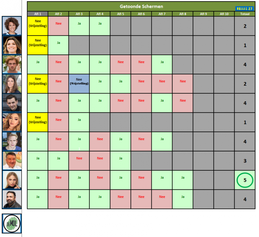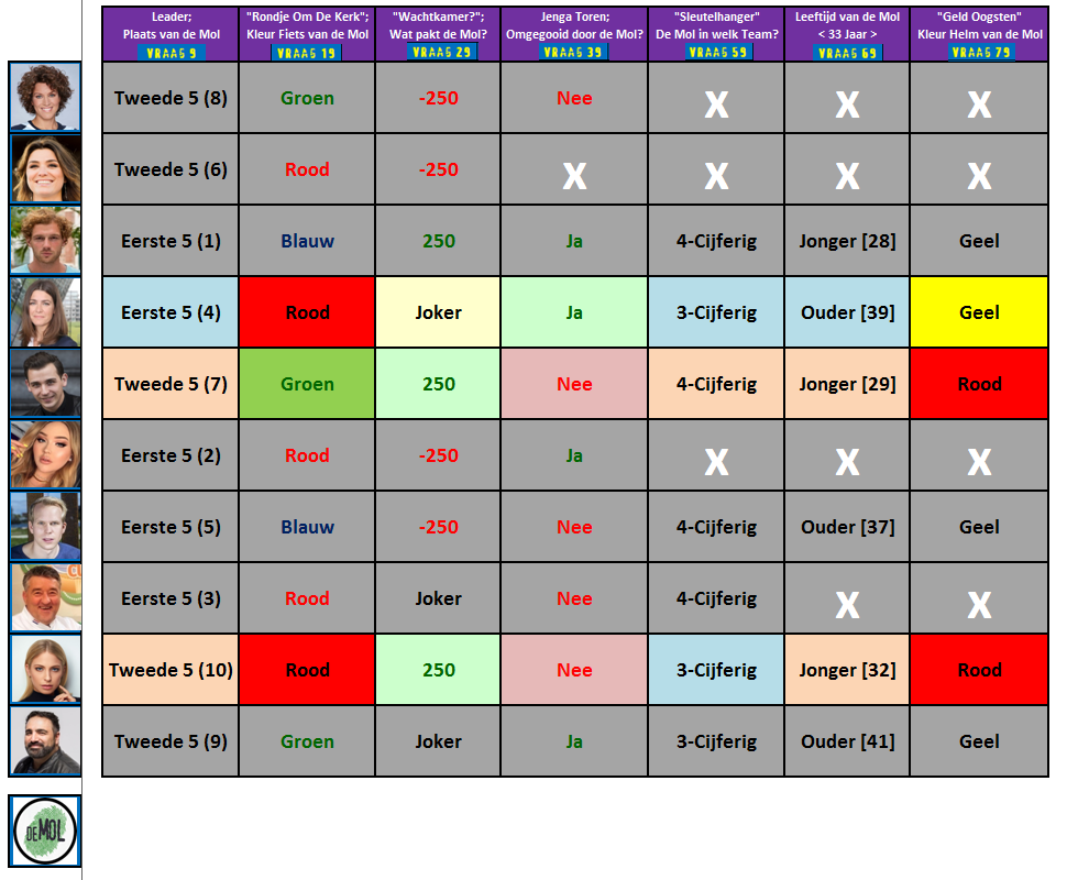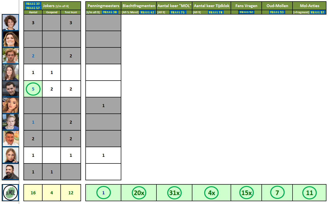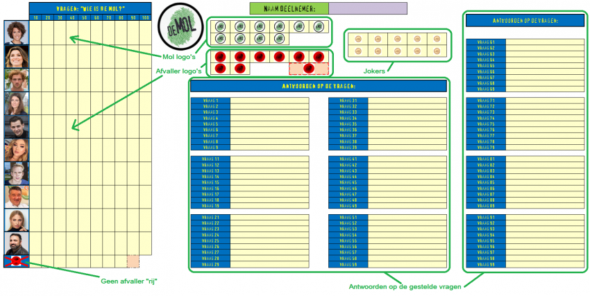 Allen, Even nog voor alle duidelijkheid; Wekelijks kun je in het invulbestand de 10 betreffende vragen van die week beantwoorden; Vraag 1 t/m 9 kun je invullen in de kolom "antwoorden op de vragen:" naast het betreffende vraagnummer (zie screenshot rechts onderin) Vraag, 10, 20, 30, etc.. is de wekelijkse "Wie Is De Mol?" vraag; deze vraag kun je wekelijks beantwoorden door het mol logo naar de linkerkant te slepen, naast de kandidaat die jij verdenkt (zie screenshot links) Dit blijft elke week 1 punt waard, dus neemt niet in puntenaantallen af zoals bij voorgaande pools en je mag ook elke week switchen). Dit geldt ook voor de afvaller van de week; Hiervoor kun je wekelijks het afvaller logo naar de linkerkant van het schema slepen naast de kandidaat die je denkt dat afvalt (zie ook printscreen). Dit zijn de bonuspunten (ook elke week 1 punt waard, tot het moment dat er nog 3 kandidaten in het spel zitten en ook hier mag je switchen). Jokers mogen alleen ingezet op vragen; - Mocht je een joker in willen zetten op een vraag dan sleep je een joker naar de betreffende vraag (zie vraag 3 in het printscreen hieronder). - Mocht je een joker in willen zetten op een "Wie Is De Mol?" vraag dan sleep je een joker naar die persoon, onder het mol logo (zie voorbeeld bij Evelien in de printscreen) - Bij de bonusvragen (de wekelijkse afvaller) kunnen dus geen jokers ingezet worden! En zoals gezegd heeft iedereen (behalve ik) 10 jokers, dus in dit voorbeeld heb je na week 1 nog 8 jokers over.