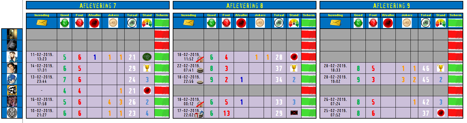 Vanavond de eerste aflevering van het nieuwe seizoen. Voordat dit seizoen begint even een aantal belangrijke punten voor de pool; Iedereen die nog mee wil doen aan de pool kan zijn/haar inzending sturen via pb naar mij voor 20:25 vanavond Als je aan de pool meedoet dan is het je eigen verantwoordelijkheid om je volgende inzending (totdat je een rood scherm krijgt) op tijd in te sturen (d.w.z. voor zaterdag om 20:25). - Er volgen dus geen reminders van mij, zoals bij voorgaande pools Om het voor iedereen zo leuk mogelijk te houden, bespreek niets inhoudelijks over de pool; - Geef niet aan of je wel of niet op tijd was met inzenden - Bespreek geen antwoorden met elkaar ("had jij ook .. op die en die vraag", "heb jij nog jokers over", etc etc.) - Post en geef niets aan over hoeveel punten je hebt of punten je nog kunt halen. Op dit moment hebben we 7 deelnemers ( @djkoelkast, @Hinse, @Ross, RM, @MarsM, @samba-boy en @TMP );