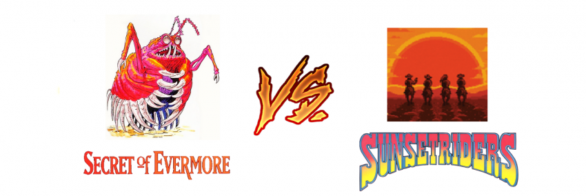 Oke, volgende battle... Sunset Riders ziet er best geinig uit, maar kreeg tijdens de voorronde niet mijn voorkeur omdat het tegen Aladdin stond. Het spel heeft een goede soundtrack, maar helaas wordt dat volledig overstemd door de vele kogels die werkelijk als een waterkanon alle kanten op sproeien. Hoe meer je schiet, hoe minder je de muziek hoort en de kogels blijken oneindig door te kunnen worden gesproeid. Het zal best een vermakelijk spelletje zijn, maar het komt bij mij over als een stel losse levels zonder samenhang en "knallen maar". Als ik naar Secret of Evermore kijk, dan ziet dat spel er grafisch heel strak uit en het spel heeft ook duidelijk meer inhoud en duurt langer om uit te spelen. Ondanks dat er amper tot geen muziek in het spel zit, nodigt het mij wel veel meer uit om dit spel te gaan spelen. Dus mijn stem gaat uit naar Secret of Evermore.