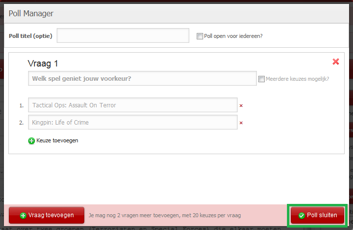 11. Naar aanleiding van de nieuwe forumsoftware is het wat omslachtiger geworden om een poll te maken hier, daarom deze tutorial voor het maken van een poll! Stap 1 Open je topic en maak je openingspost Stap 2 Klik rechts op "poll beheren" Je gaat dan automatisch naar de Poll Manager Stap 3 Vull de vraag van je poll in. Geef daarna de eerste keuzemogelijkheid in voor je poll. Wil je meer keuzes aanbieden: Klik op "keuze toevoegen" Stap 4 Lees alles na en als je blij bent met je poll, klik dan op "poll sluiten" Stap 5 Lees nog eens je openingspost na en post dan je topic. Als alles goed is gegaan ziet je poll er dan goed uit Veel succes bij het maken van nieuwe polls