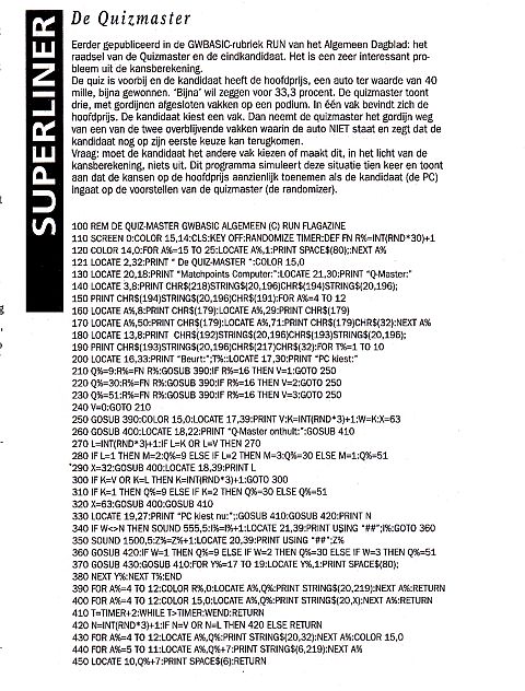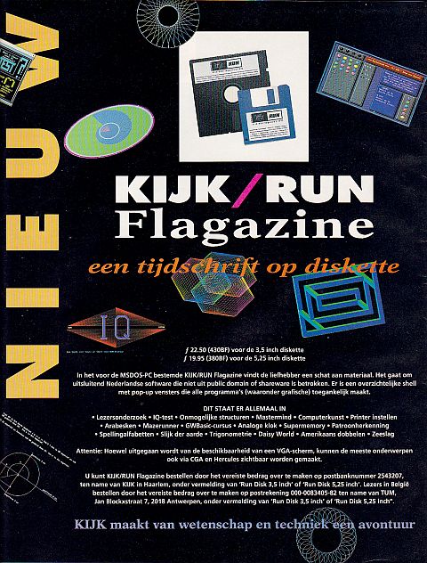 Een tijdschrift op diskette Van de week was ik in een oude KIJK van juli 1992 aan het bladeren toen ik deze advertentie zag staan. Tjonge, wat een geld, dacht ik! In hetzelfde blad staat deze listing afgebeeld: Hij is ge-OCRed, maar nog niet foutloos... wel al een heel eind te 'runnen'. Zodra hij foutloos is, load ik hem up. Zouden er meer nederlandse tijdschriften op diskette hebben bestaan? Ik ken er nog eentje waar ik een paar van heb ivm de nederlandse tekstadventures, dat is de nederlandse UPTIME. Ik zie hier maar weinig gegevens over.