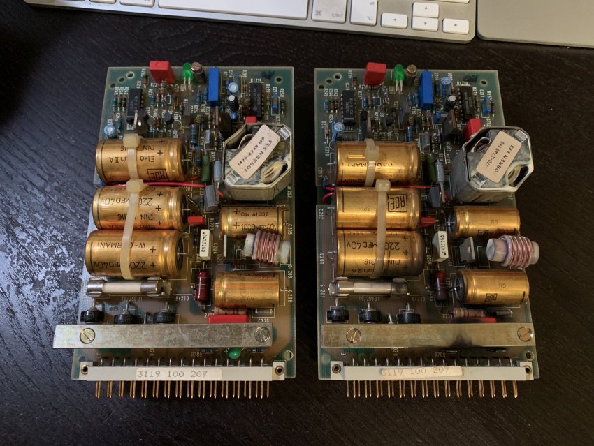 Minuteman 17 februari 2019 gepost Auteur 17 februari 2019 gepost (aangepast) Uiteindelijk na een lange rit goed thuis aangekomen en de apparaten naar binnen gesjouwd. Ze zijn wat dat betreft wel heel solide gemaakt (lees loodzwaar) Na een beperkte poetsbeurt heb ik de machines eens nader bekeken. De machines waren eigenlijk best schoon, van binnen was er nauwelijks stof te vinden. Wel waren de wieltjes wat vies dus die moesten even schoon voordat ze het marmoleum over konden, even de garagekrik eronder. Hier en daar wat oude stickers verwijderd en een eerder apart gezette monitor en Waveform in de BCN gestopt. Dat ziet er al gelijk goed uit, al denkt mevrouw Minuteman daar anders over 😅 Dan maar eens ergens een stekker indoen, eerst de monitoren en de Waveforms. De eerste monitor deed niets, zelfs geen lichtje. De tweede monitor kwam op en spontaan begon TopPop te spelen. (het kan zijn dat dit van youtube afkwam overigens) De Waveforms waren verassend. De ene knetterde bij het insteken van de stekker en begon te roken en te stinken. De andere deed het en kwam met deze Dan de BNC's zelf. Apart ik dat het een 52 en een 42 is. Hoewel ze er hetzelfde uitzien en bijna alle onderdelen het zelfde lijken zitten er toch subtiele verschillen in. Noem net dapper, dom of onnadenkend maar ik heb de stekker in de 52 gestopt. Dat ging aanvankelijk goed, maar na een halve minut begon er toch wat te roken vanuit de voeding. Snel de stekker eruit gehaald natuurlijk en de buitendeur opengedaan, wat een meur.. Ik verwacht dat er een ingangscondensator of iets dergelijks is opgerookt, daar gaan we van de week eens voor zitten en kijken of we kunnen achterhalen wat het is. De voeding van de 42 ziet er hetzelfde uit dus we hebben een reserve, maar die is even oud en zal ook wel roken. 17 februari 2019 aangepast door Minuteman Quote